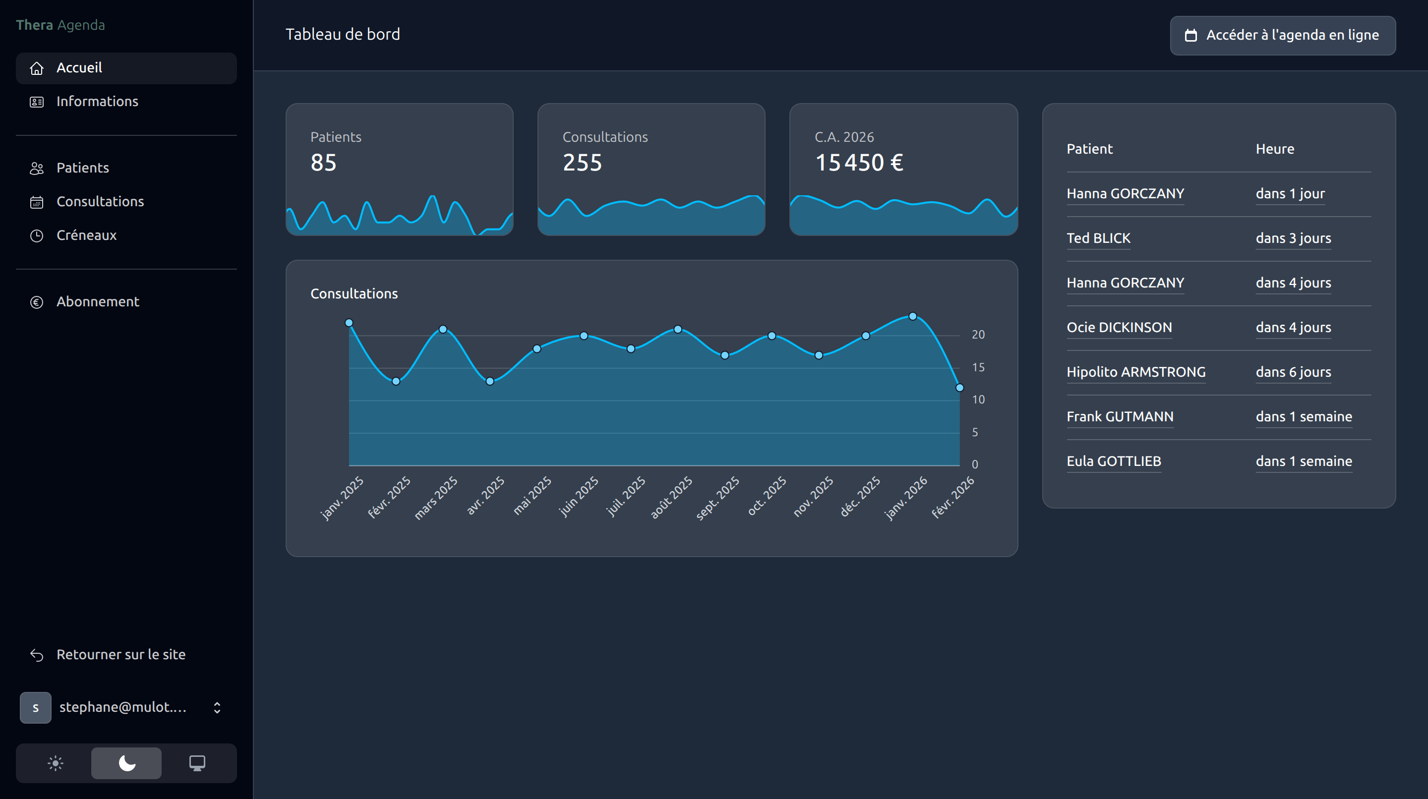 Suivez vos indicateurs clés en un coup d’œil : nombre de consultations, patients, revenus projetés et évolution de votre activité sur 12 mois. Les tableaux de bord incluent une navigation mensuelle intuitive, des graphiques interactifs et un comptage automatique des patients uniques par période.